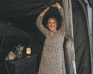 • Lyst overseilstak i varme fargetoner skaper en lys og innbydende atmosfære i teltet