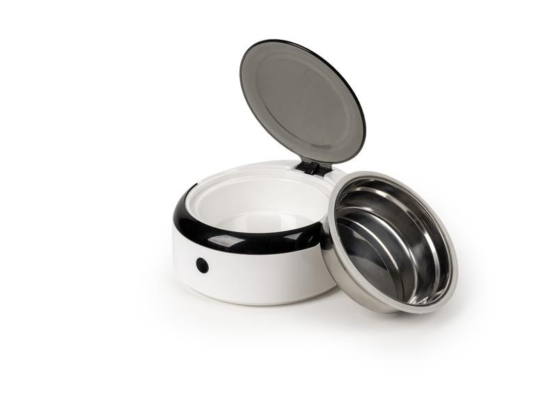 Sensoren i skålen gjenkjenner kjæledyret ditt og åpner lokket. Lokket lukkes automatisk igjen. Dermed holder maten seg frisk og fluer holdes unna. Krever 4x AA-batterier (ikke inkludert). Skålen i rustfritt stål er forseglet med en avtakbar silikonring, men er lett å ta ut og rengjøre.