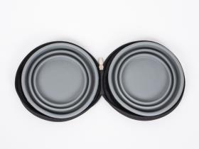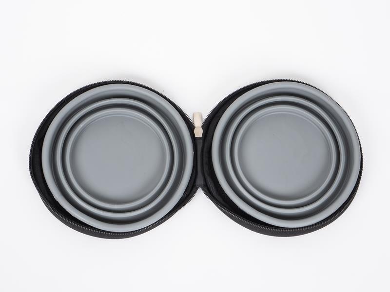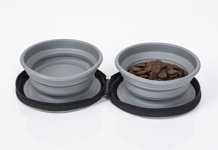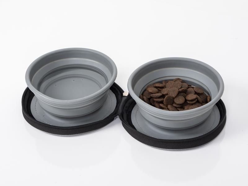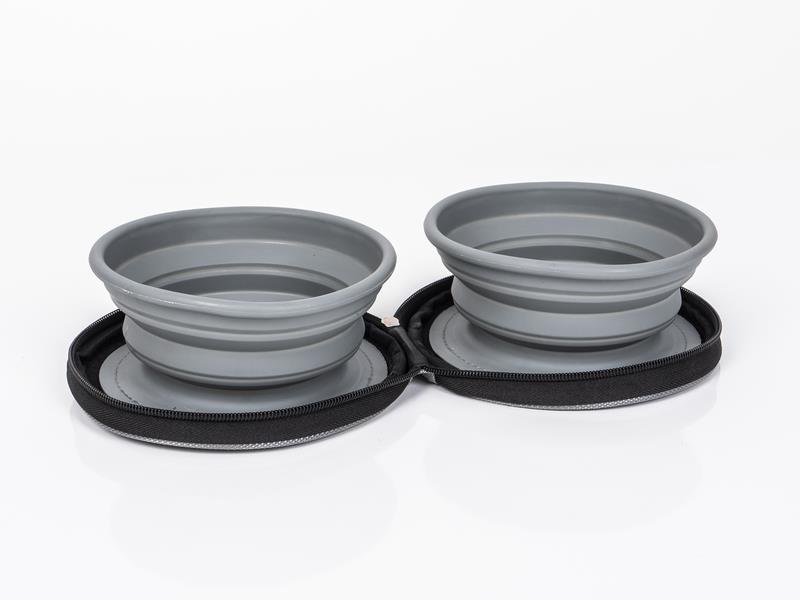 Perfekt for reisen: 2 sammenleggbare silikonskåler, som er festet og kan tas av i en praktisk glidelåslomme med borrelåslukking.