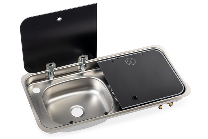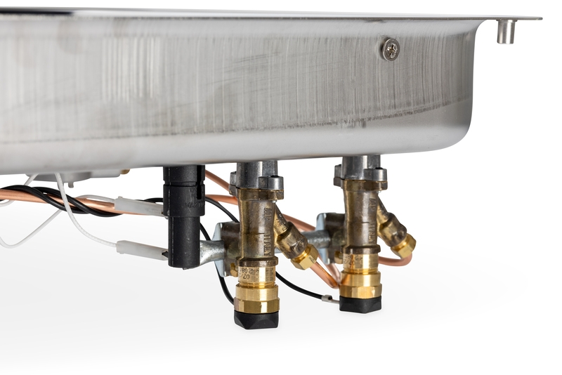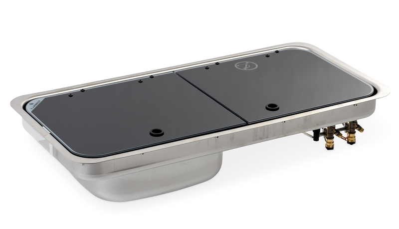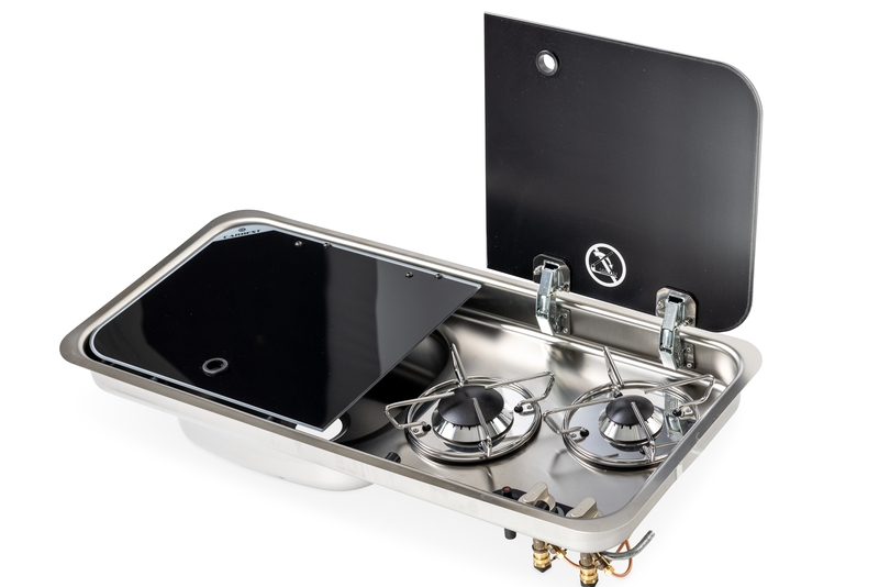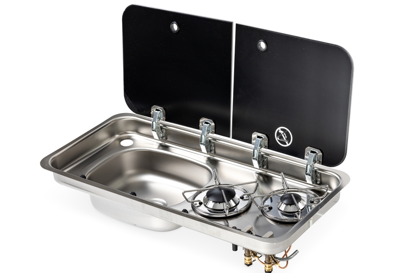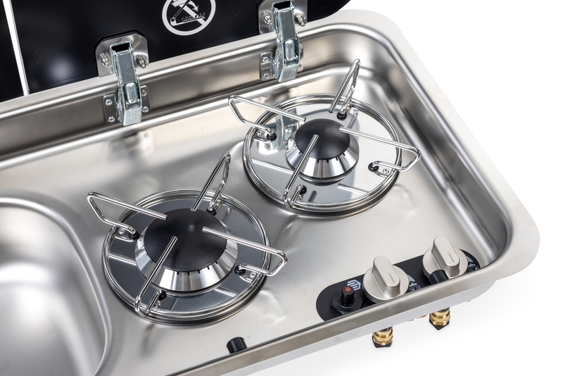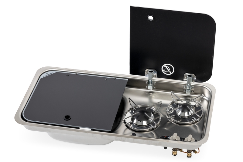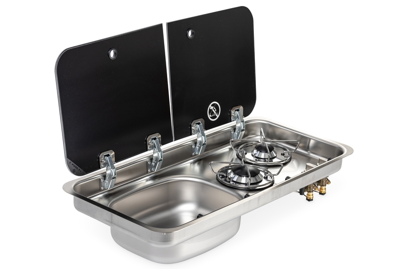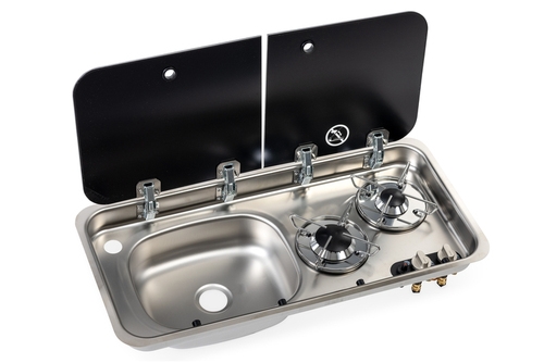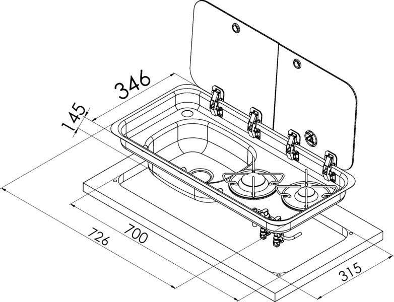 Rustfritt stål, betjeningselementer nederst, 2-bluss, med piezo-tenning, tennsikring og automatisk gassavstenging ved lukking av kokeplate-glasslokk, effekt: 1x 1,8 kW, 1x 1,0 kW, gassforbruk 204 g/t, 30 mbar, innbyggingsmål: B688 x D319 mm, dimensjon: B726 x D346 x H145 mm. Borehull for vannkran ca. 33,5 mm (vannkran er ikke inkludert, anbefaling 705048). Mål vask: B300 x D240, avløpsgarnityr: Type E (f.eks. 705082).