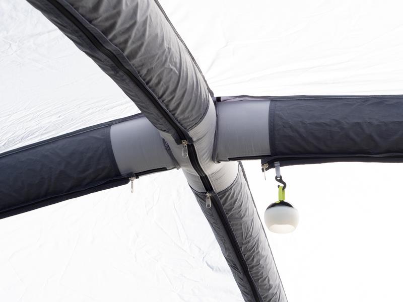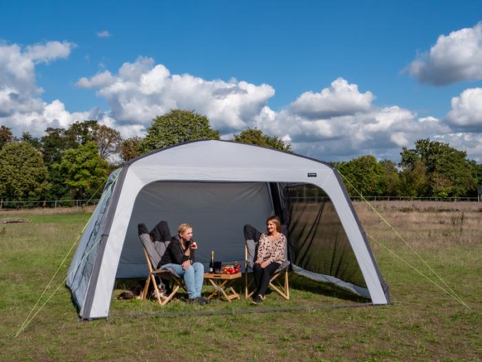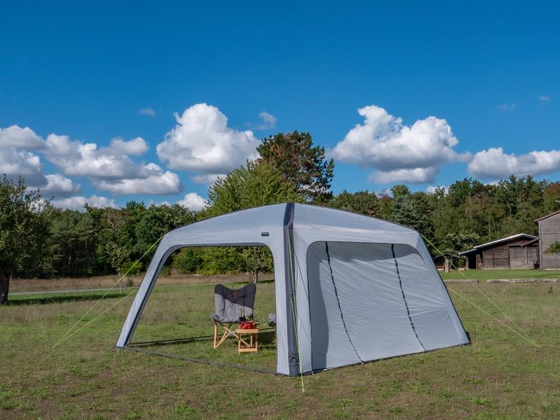 1 paviljong med 1 TPU luftslange, luftpumpe, 4 sidevegger: 2x med myggnetting, 1x lukket, 1x med glidelåsdør, knagger, pakkepose