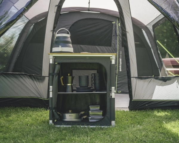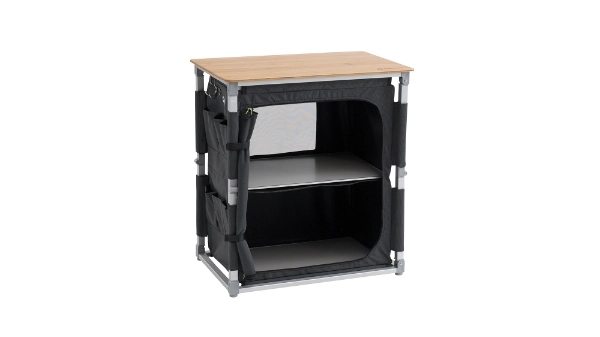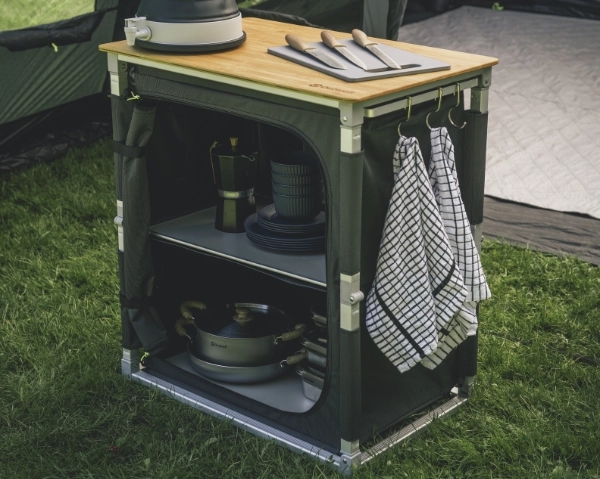 I lekkert sort/grå stoff med solid bambusbordplate og tre praktiske kroker på den ene siden og oppbevaringslomme på den andre. Kjøkkenbordet er utstyrt med uttrekkbar holder for oppvaskbalje eller avfallsbeholder samt vindskjerm for å beskytte brennerens flammer.