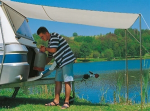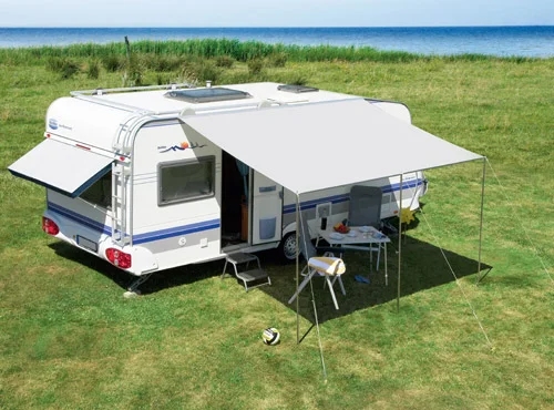 Et solseil som er nyttigt overalt! Som mobil carport på campingvognenes hekk, på siden - som markise, der gir skygge. Fremstilt i trailtex-stoff der kan ånde, er Vaskbart, lysekte og veldig sterkt.